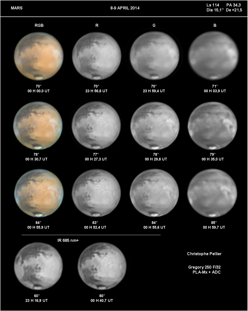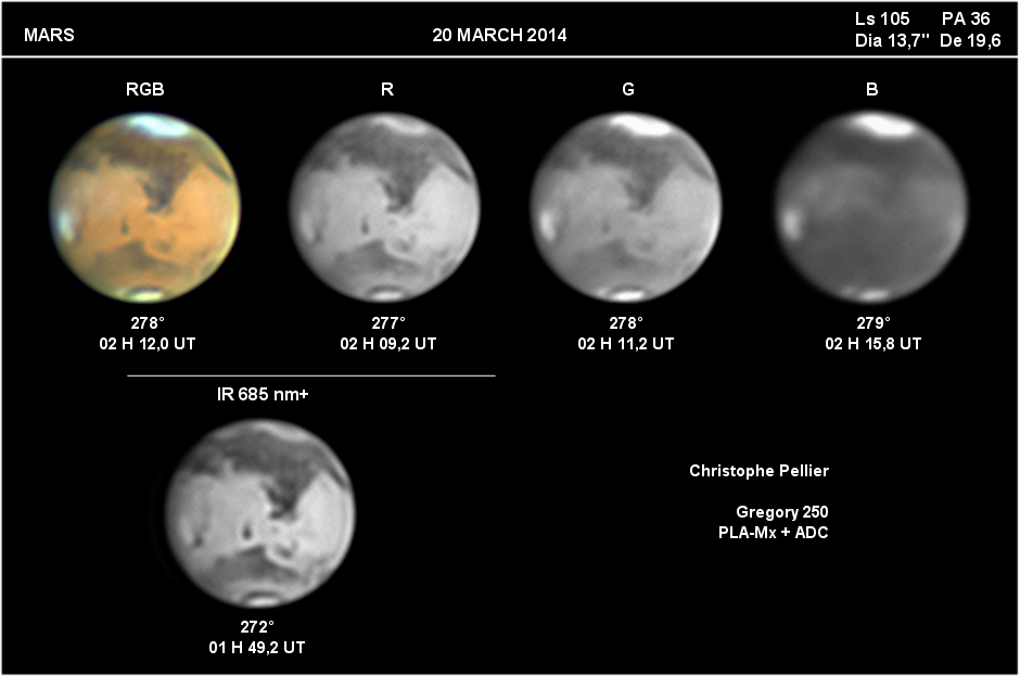 - Paramètres de prise de vue : Films AVI réalisés avec filtres RVB et IR 742 astronomik + W47 Meade + UV Astrodon