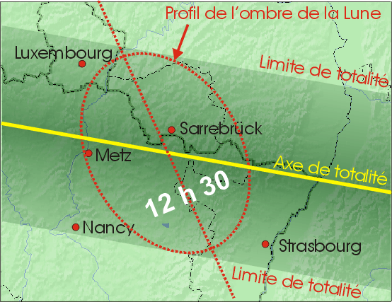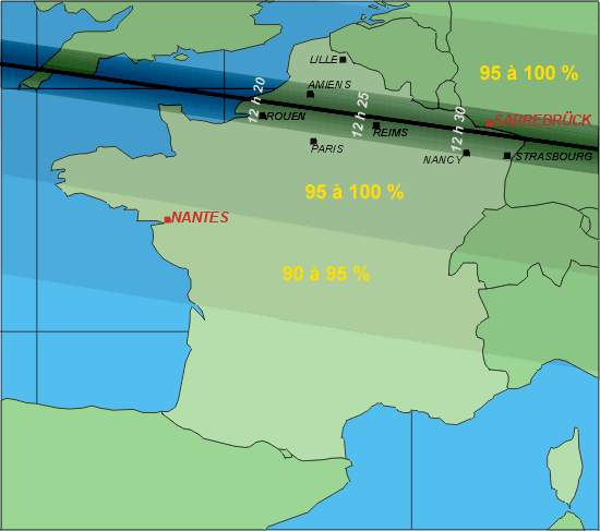 L'éclipse a été observable de toute la France mais est restée partielle pour la majeure partie du pays (partielle à 93,5 % sur Nantes). Seule une bande de 110 km de large, partant de la Normandie et allant jusqu'à l'Alsace, a été le théâtre de l'éclipse totale, bande subitement plongée dans la nuit en plein midi.